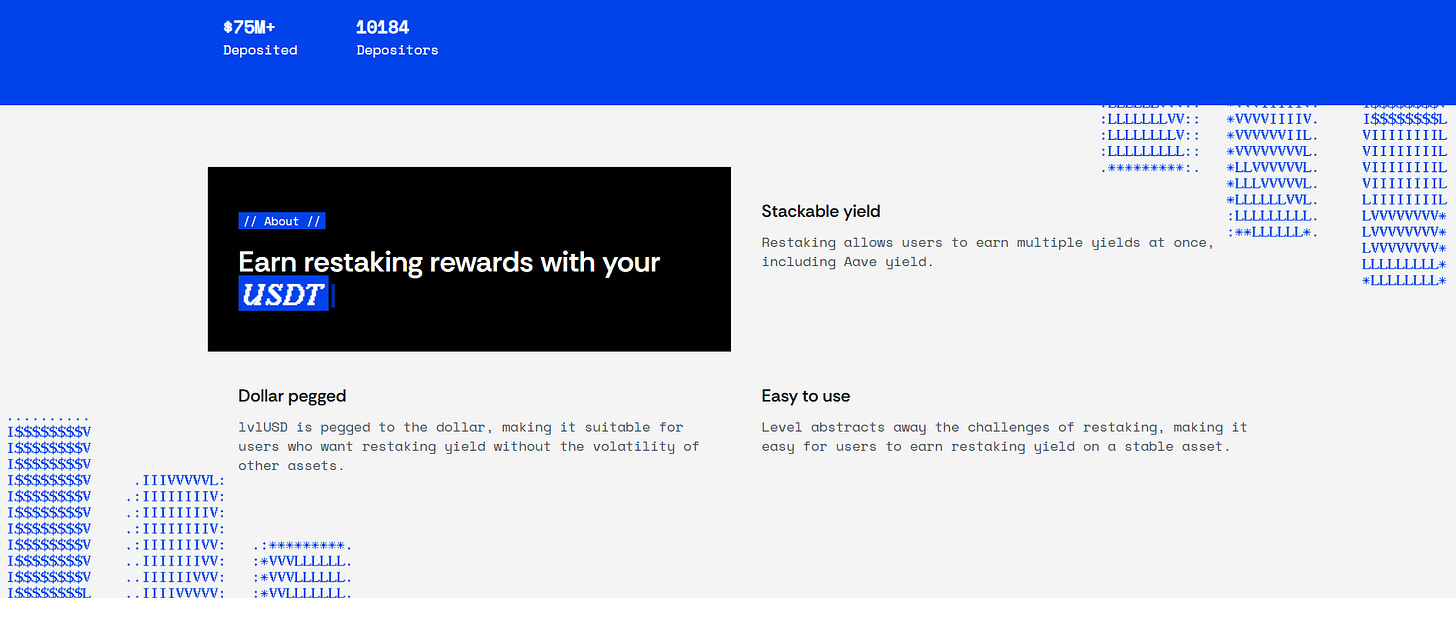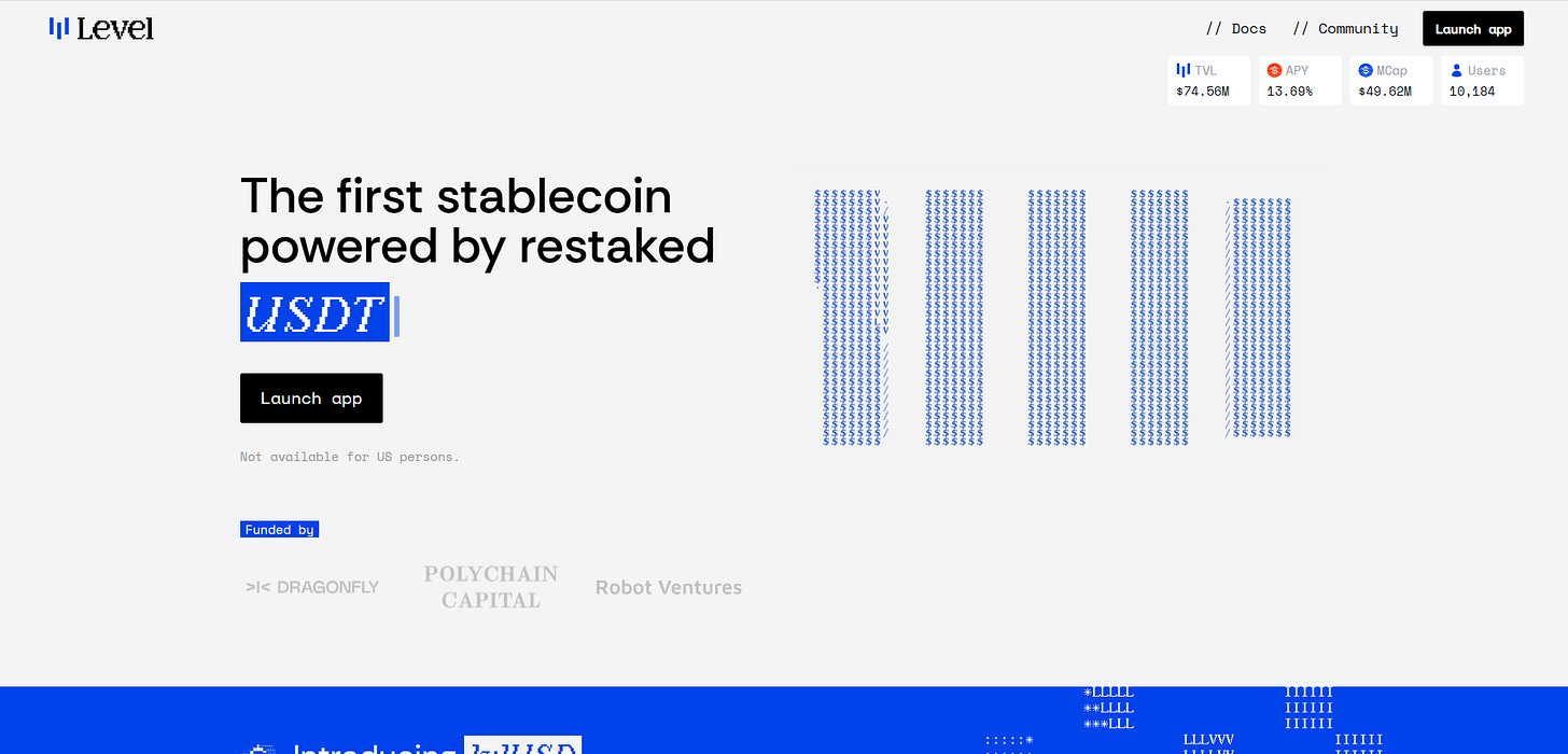 lvlUSD is a stablecoin that lets you earn yield from lending and shared security protocols without direct exposure to crypto-asset beta. It’s well backed and currently has a $50mm market cap, with $75mm in deposits.