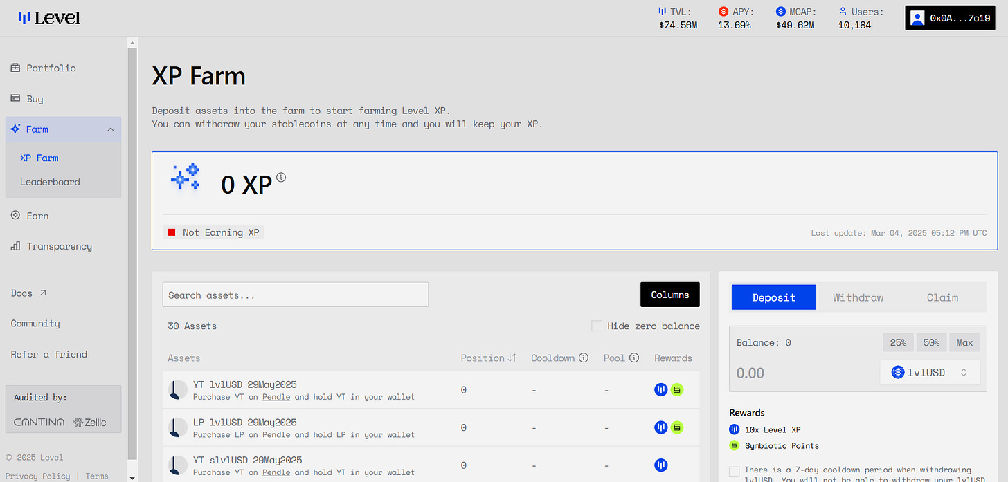 From here navigate to your chosen way to farm XP and partner points, earning multiple airdrops simultaneously. If you want to speculate with XP and earn Symbiotic points (EigenLayer’s competitor) you get a 48x XP multiplier for levelUSD and 1x for Symbiotic by picking the 1st LP option from Pendle from that list, maturing by May 2025.