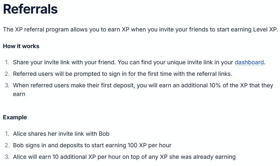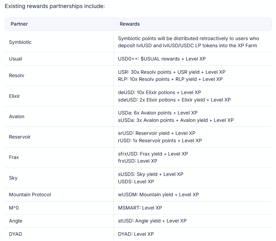 ”Level users can earn Level XP on top of rewards from partner protocols. Partner rewards will typically be tracked and retroactively distributed by partners (for stablecoin partners) or by Level (for restaking/AVS partners), and may not be visible on dashboards. Level XP is updated live on the Level dashboard.”